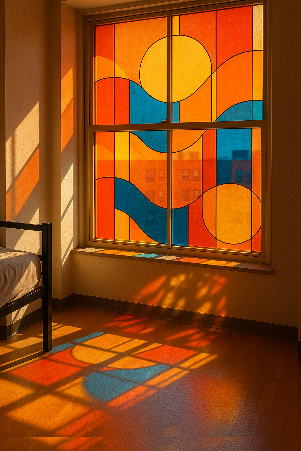 The Geometric Wave window vinyl transforms even the dullest space into a sunlit sanctuary. Its flowing shapes and warm tones of amber, blue, and coral recreate the soft glow of sunrise, turning ordinary glass into living art.